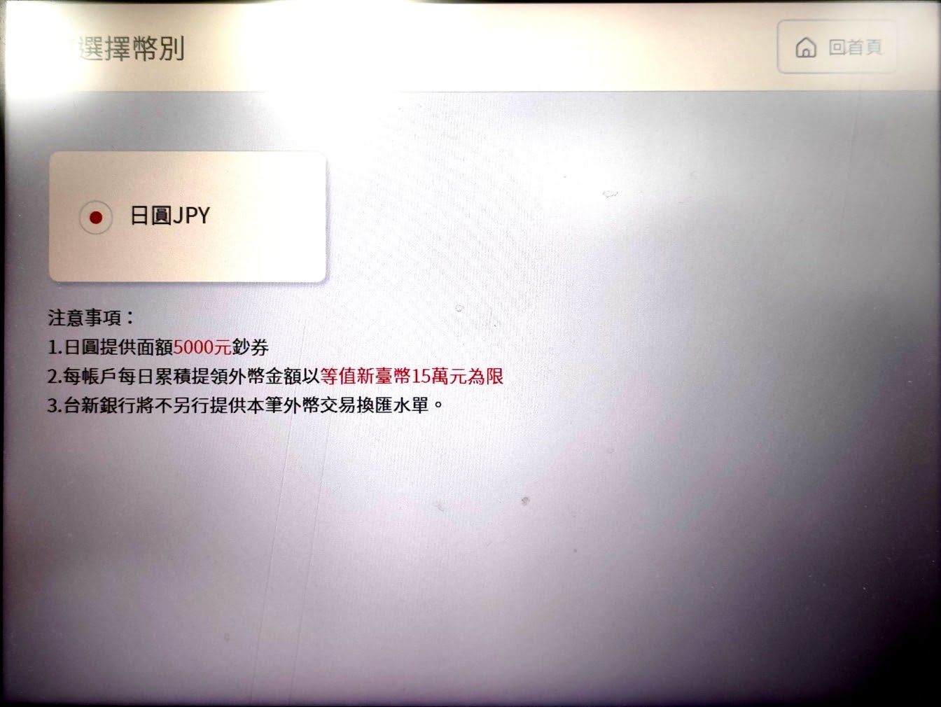 - 選擇要提領的外幣種類,因為這台機器只支援日圓,請點選