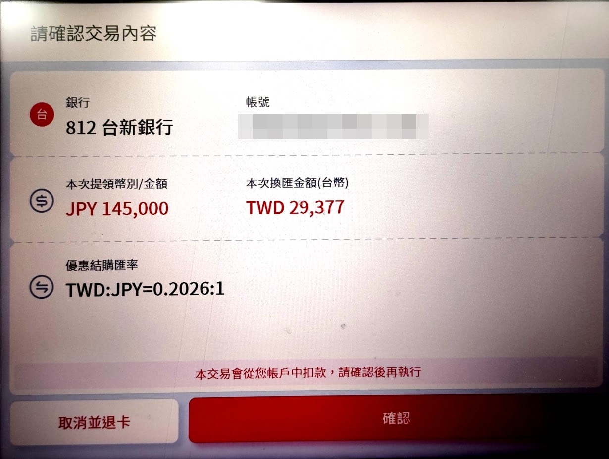 0.2026:1且最大日圓幣值為5,000,因為我要換台幣三萬元,所以經過簡單的計算可換:30,000 / 0.2026 = 148,000,所以我選擇輸入145,000日圓,再選擇確認。
